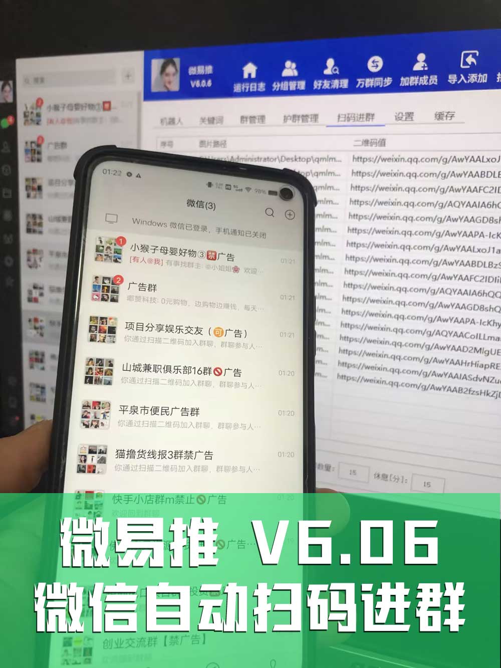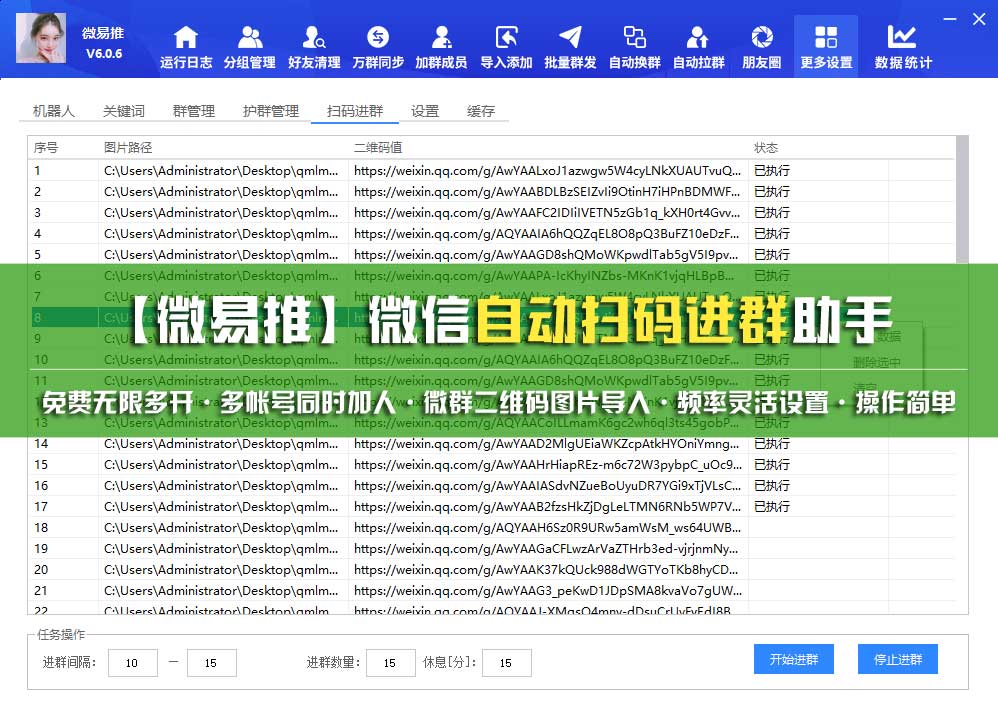 新版微易推6.06版新增支持导入微信二维码自动扫码进群,可无限多开,多个帐号同时加群
