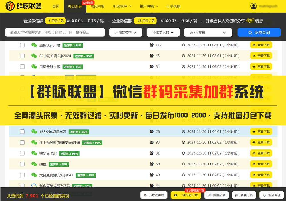 群脉联盟是目前在圈内口碑好、群质量高、群数量超多的微信群采集加群系统,推广还能赚高额返佣奖励。系统稳定运营多年,全网多渠道实时采集大量的微信群&企业群,群内都是真人活粉,质量高,广告少,独创的AI群码检测技术能自动过滤不能进的“无效群”,刚发布的群100%都能进。