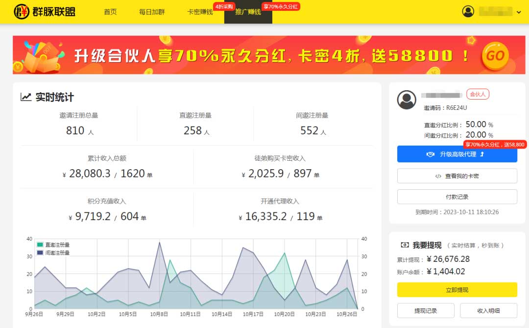 开通代理最高享55%的两级返佣奖励,采购卡密仅需4折,返佣收入在电脑端或手机端后台随时申请提现到绑定的支付宝账号,秒到账!