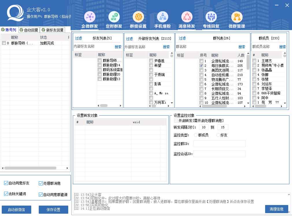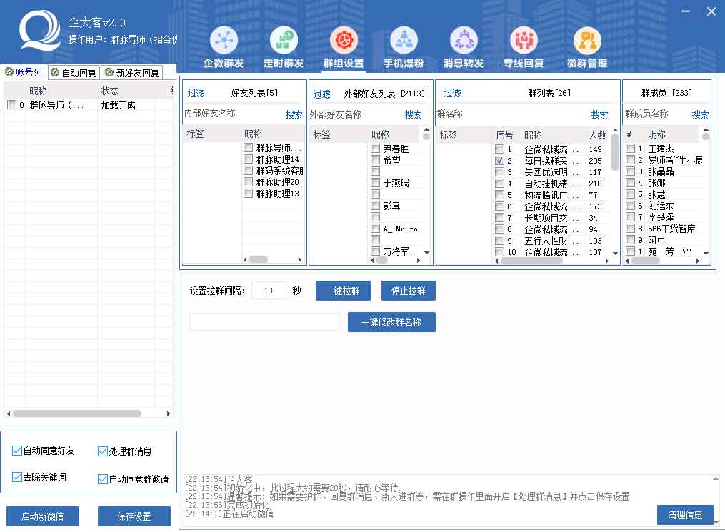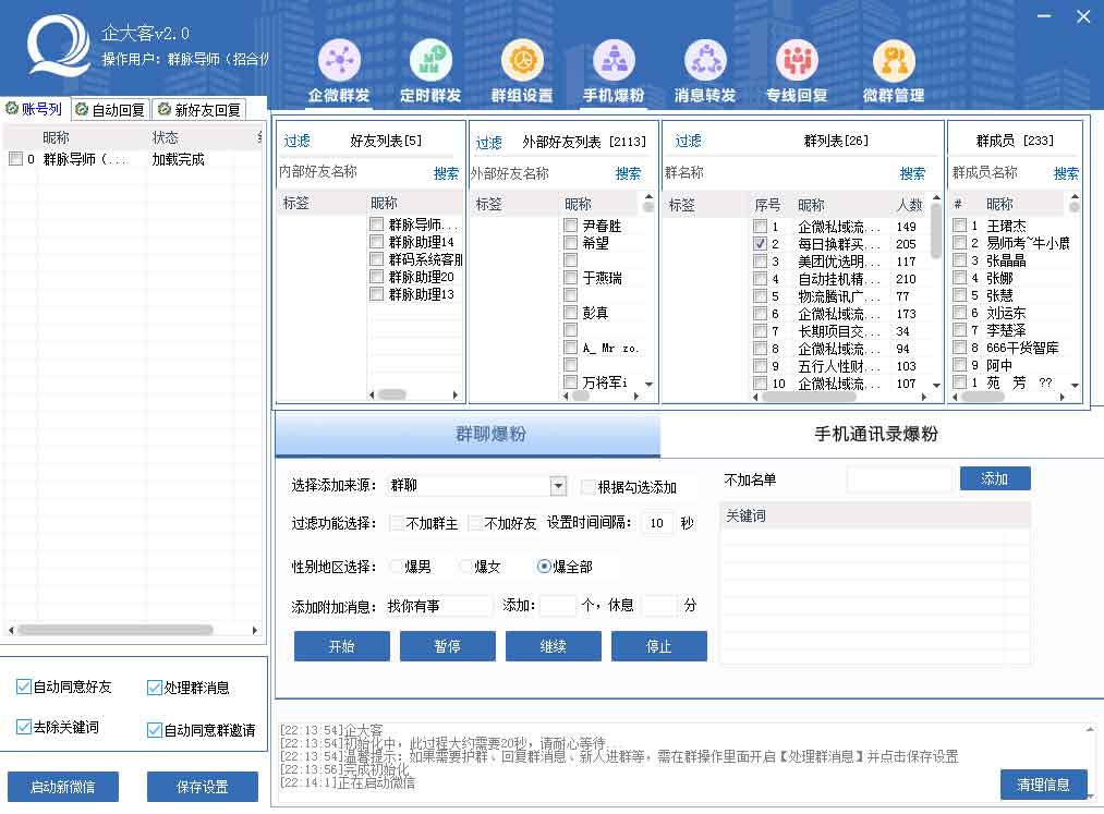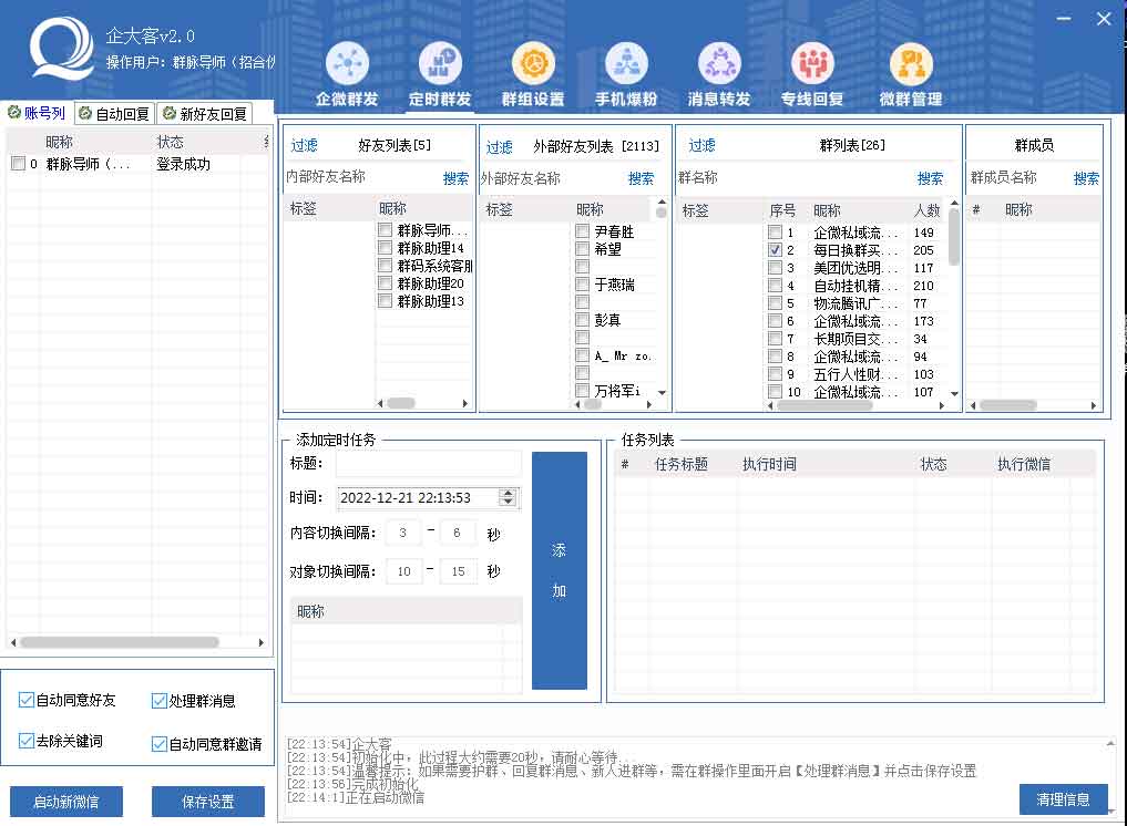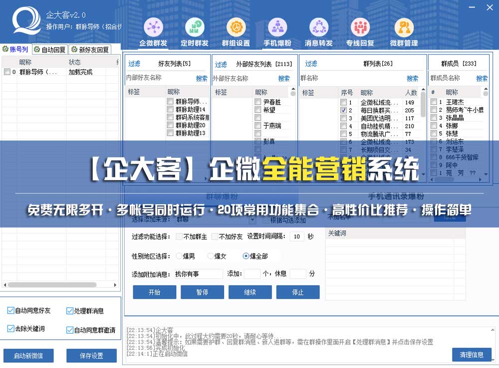 企大客是一款综合性比较高的营销软件,15项社群运营常用功能,功能包括:自动同意邀请进群、自动邀请好友进群、自动回复、定时群发、手机号加人、群内好友加人、自动同意好友、导出群成员、新人欢迎语、关键词回复等社群运营常用功能,支持免费无限多开,性价比很高,预算有限的客户强烈推荐 ...