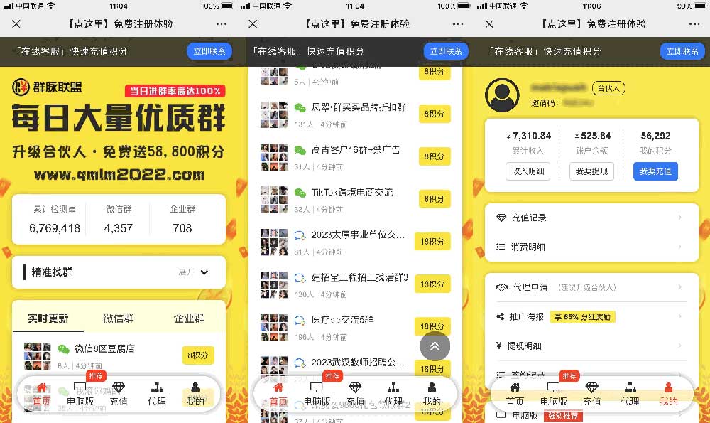 平台稳定运行多年,持续升级迭代,群码质量和数量都在大幅提升,正规公司运营,合法合规的推广模式,无需担心合作风险~