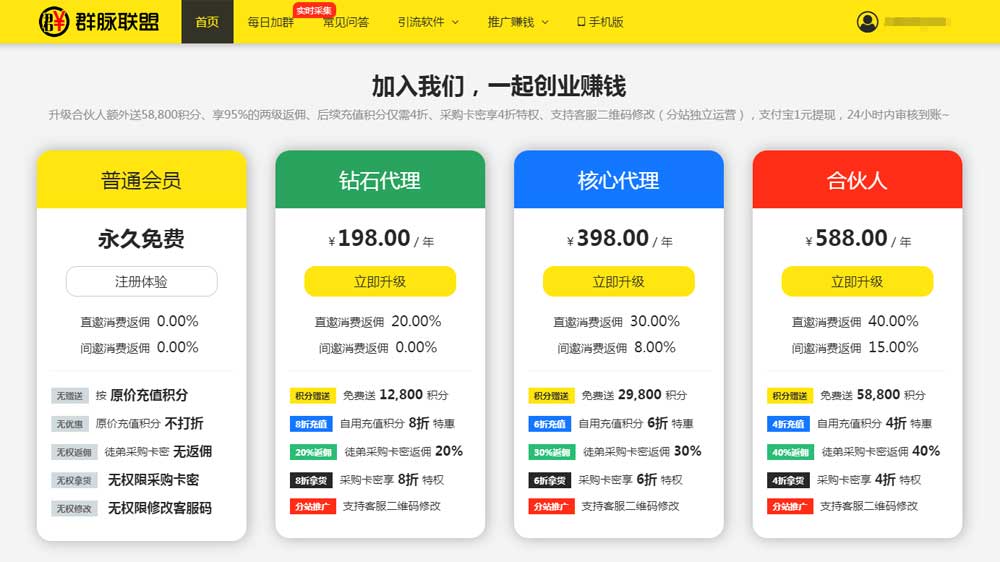 不同等级的代理,充值积分的价格折扣不同!系统会按您的当前代理等级自动计算折扣优惠!合伙人充值积分仅需4折,联系客服购买卡密充值积分仅需2折~